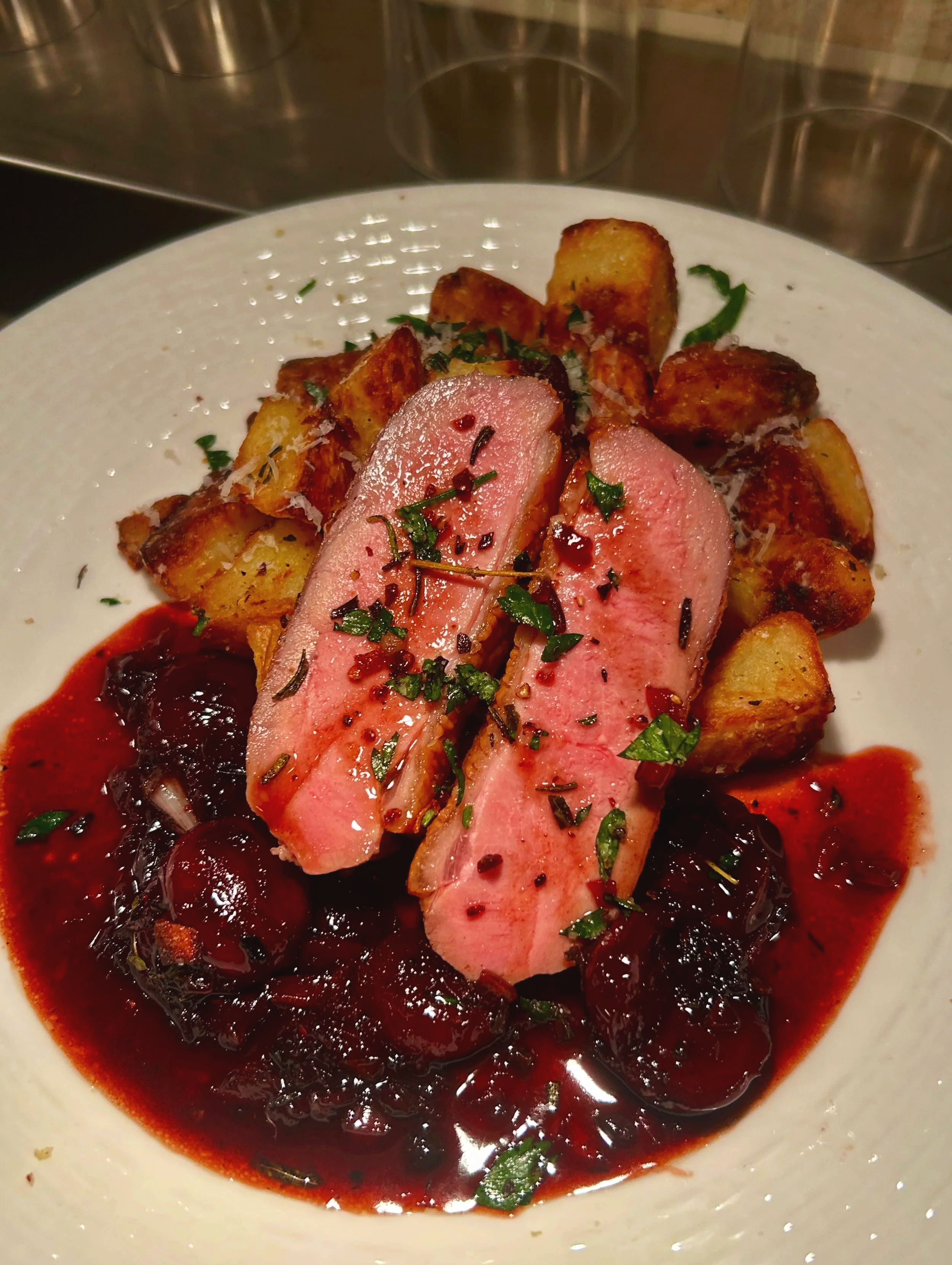 Pan Seared Duck Breast and Roasted Potatoes w/ Cherry Balsamic Reduction